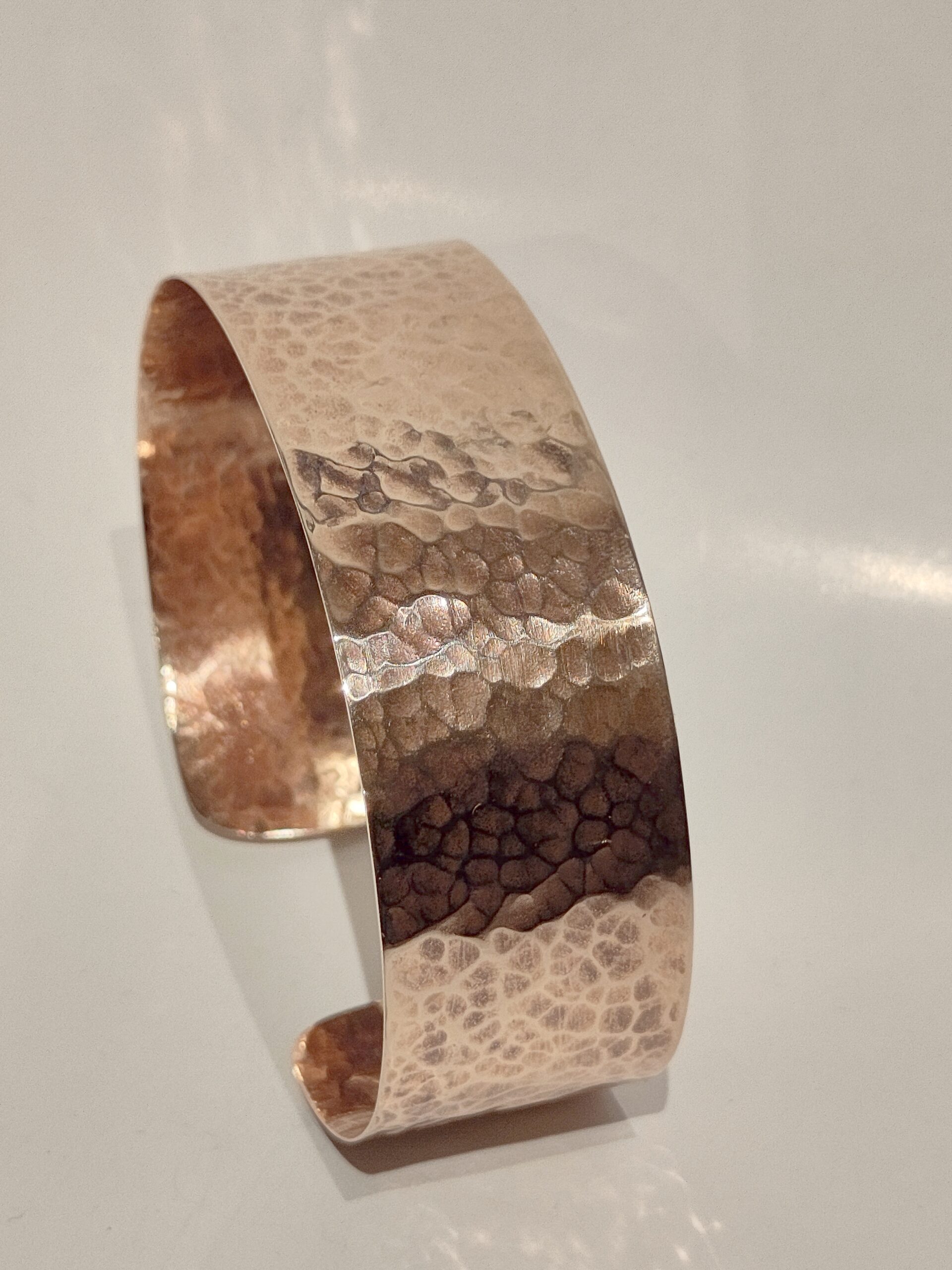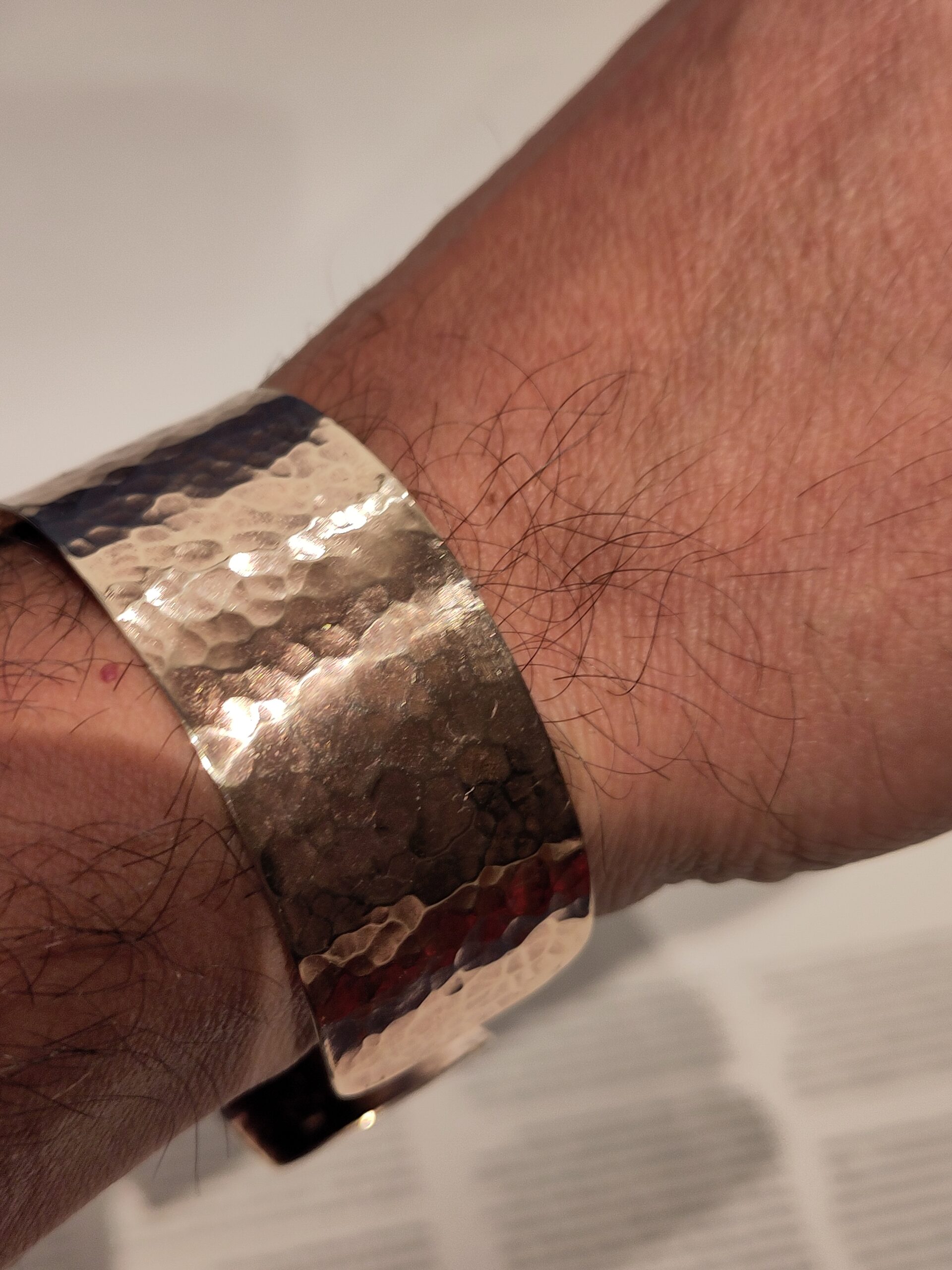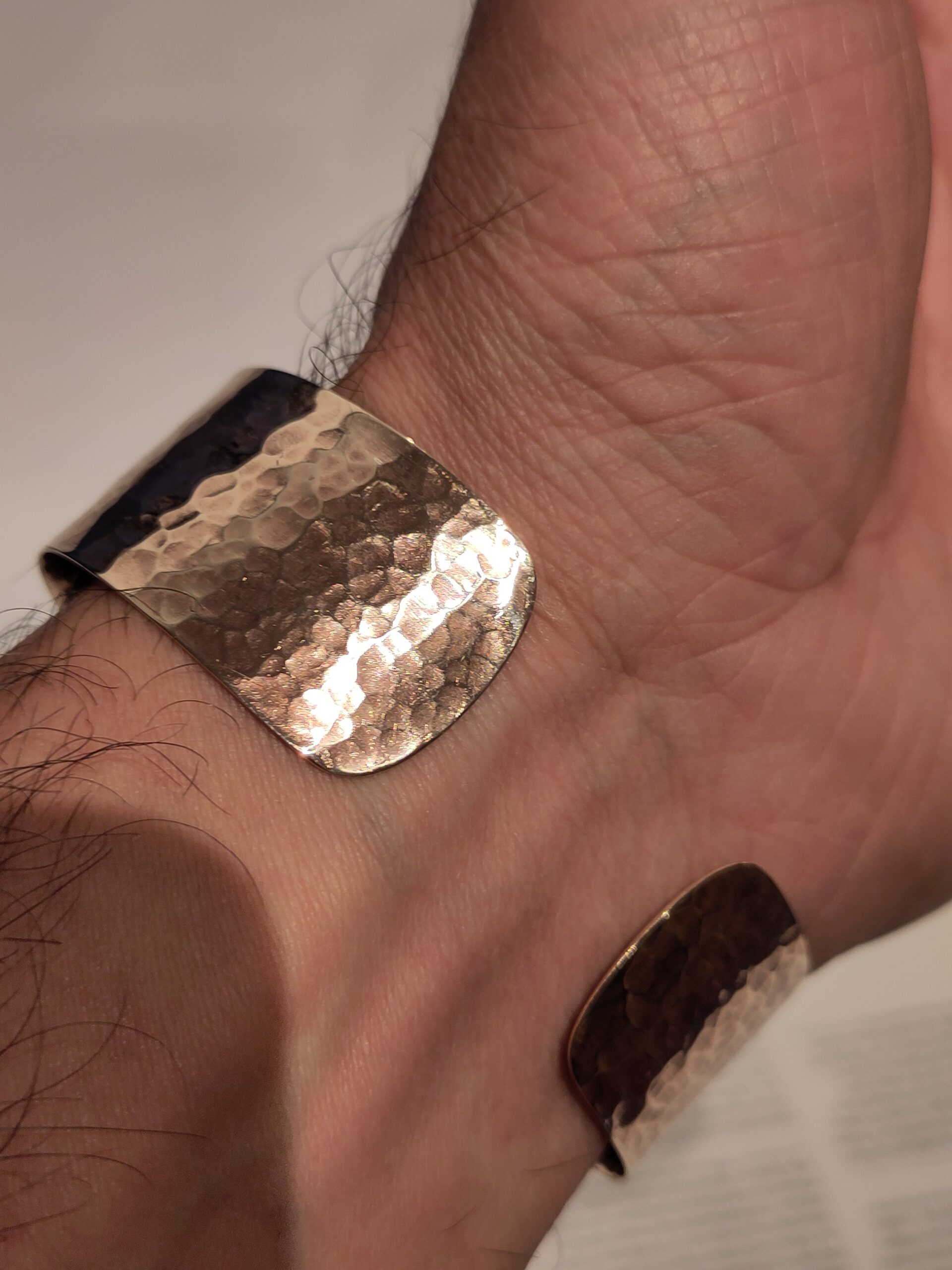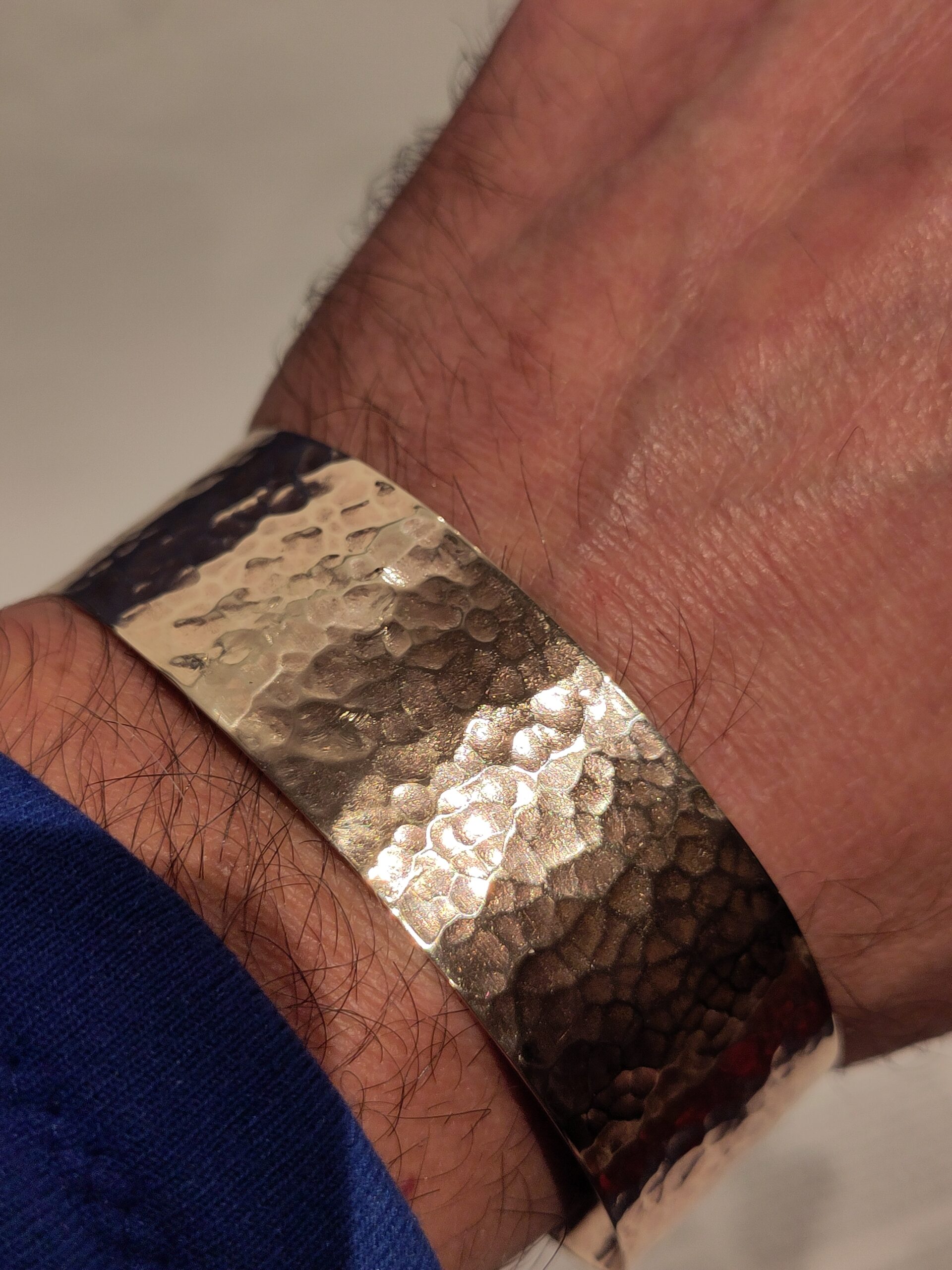Die Länge des Armreifs ist auf den Handgelenksumfang des Trägers bzw. der Trägerin abgestimmt. Das Maß wird individuell festgelegt, sodass der Armreif optimal am Handgelenk sitzt. Auch die Breite lässt sich von schmal bis sehr breit frei wählen. Das Ergebnis ist eine ausgewogene, passgenaue Form, die sich angenehm am Handgelenk anlegt. Auf standardisierte Größen wird bewusst verzichtet, mit besonderem Augenmerk auf Proportion, Passform und Tragekomfort.