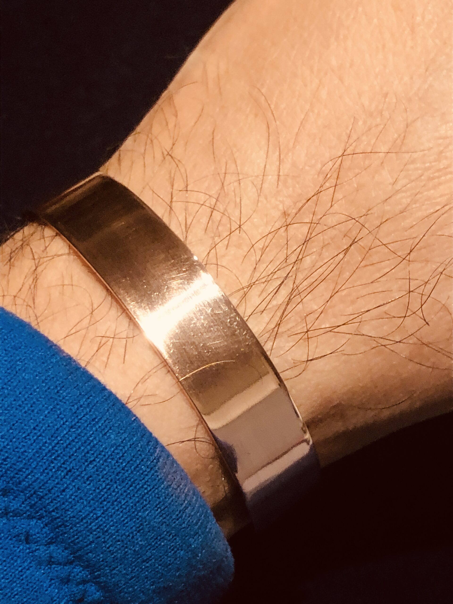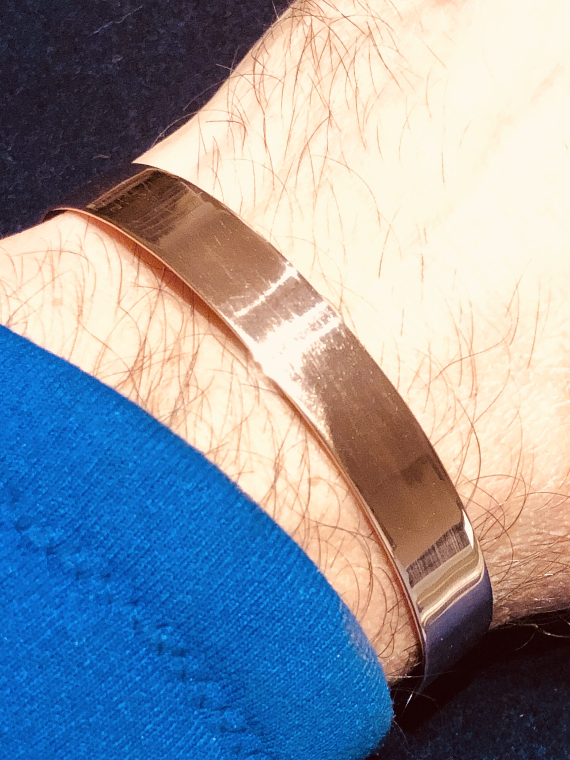 Die Länge des Armreifs ist auf den Handgelenksumfang des Trägers bzw. der Trägerin abgestimmt. Das Maß wird individuell festgelegt, sodass der Armreif optimal am Handgelenk sitzt. Auch die Breite lässt sich von schmal bis sehr breit frei wählen. Das Ergebnis ist eine ausgewogene, passgenaue Form, die sich angenehm am Handgelenk anlegt. Auf standardisierte Größen wird bewusst verzichtet, mit besonderem Augenmerk auf Proportion, Passform und Tragekomfort.