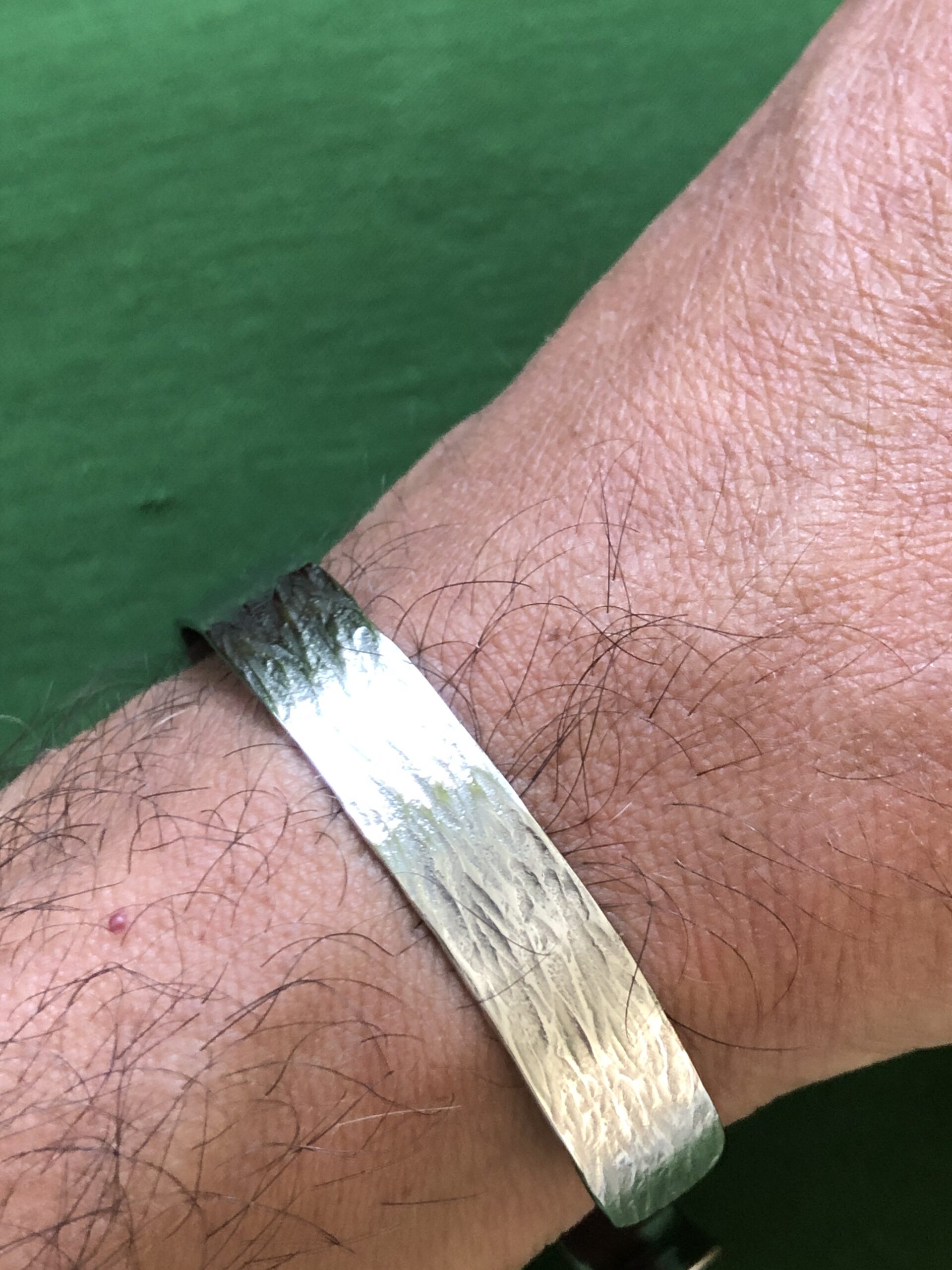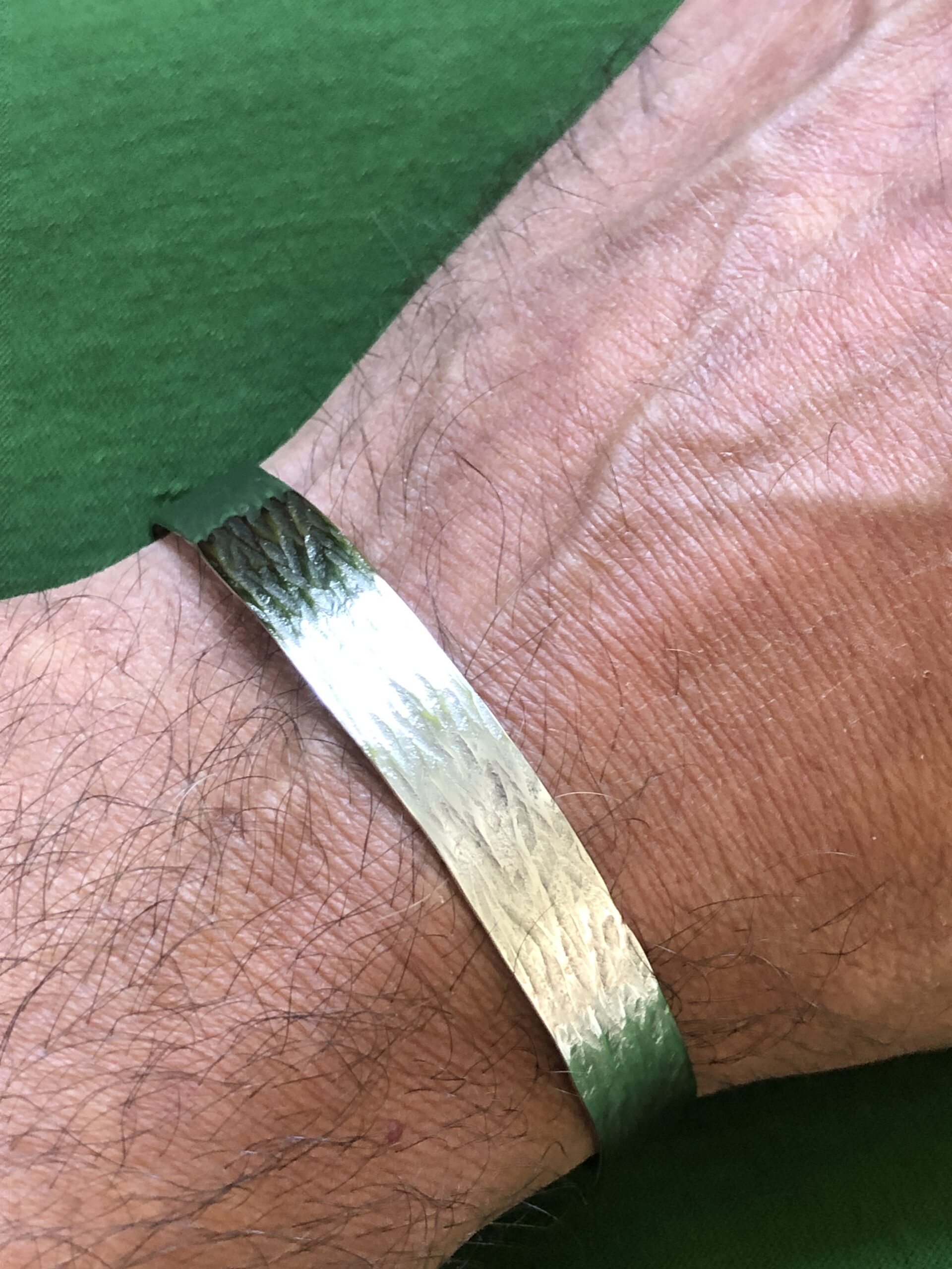 Die Länge des Armreifs ist auf den Handgelenksumfang des Trägers bzw. der Trägerin abgestimmt. Das Maß wird individuell festgelegt, sodass der Armreif optimal am Handgelenk sitzt. Auch die Breite lässt sich von schmal bis sehr breit frei wählen. Das Ergebnis ist eine ausgewogene, passgenaue Form, die sich angenehm am Handgelenk anlegt. Auf standardisierte Größen wird bewusst verzichtet, mit besonderem Augenmerk auf Proportion, Passform und Tragekomfort.
