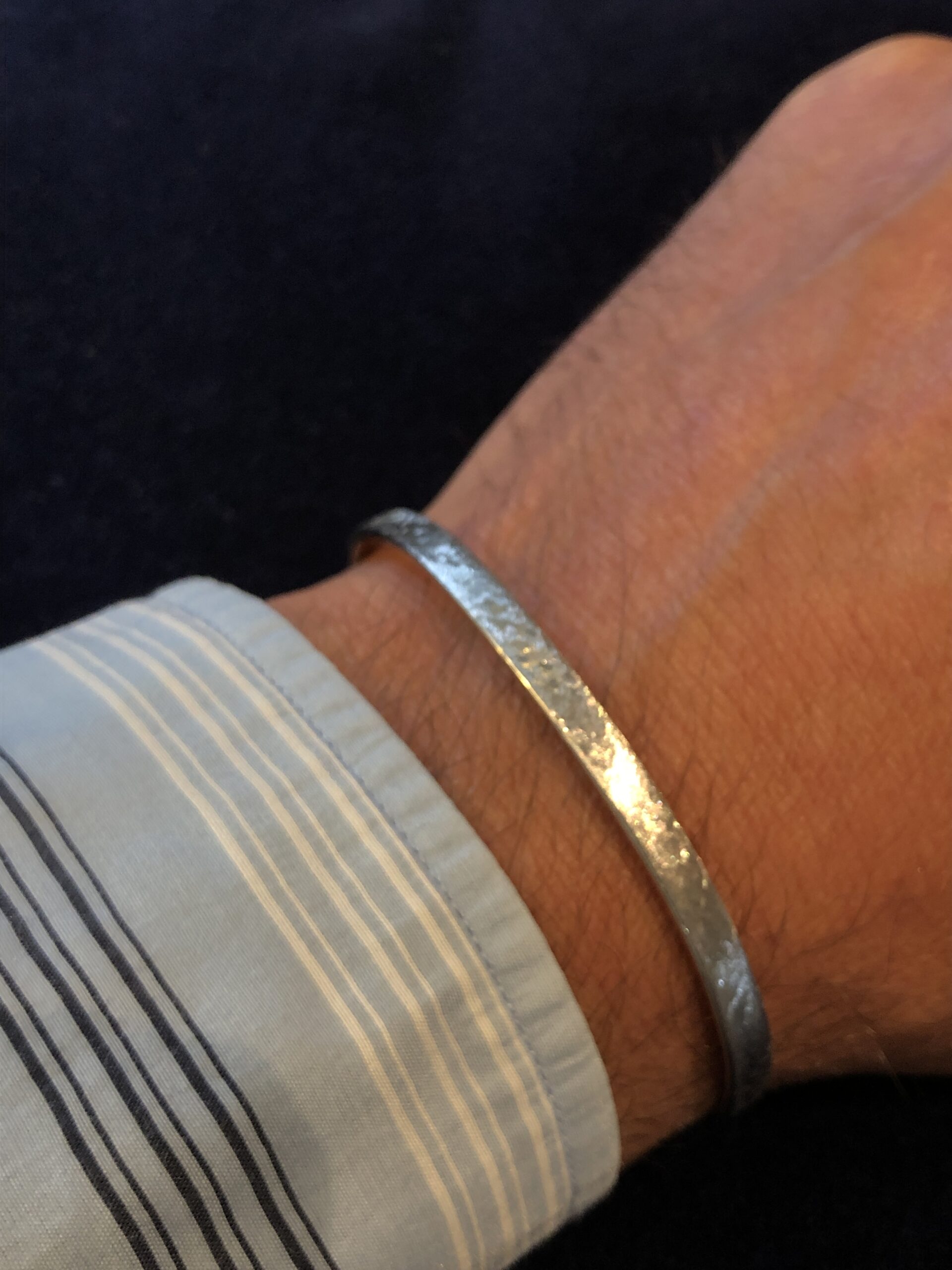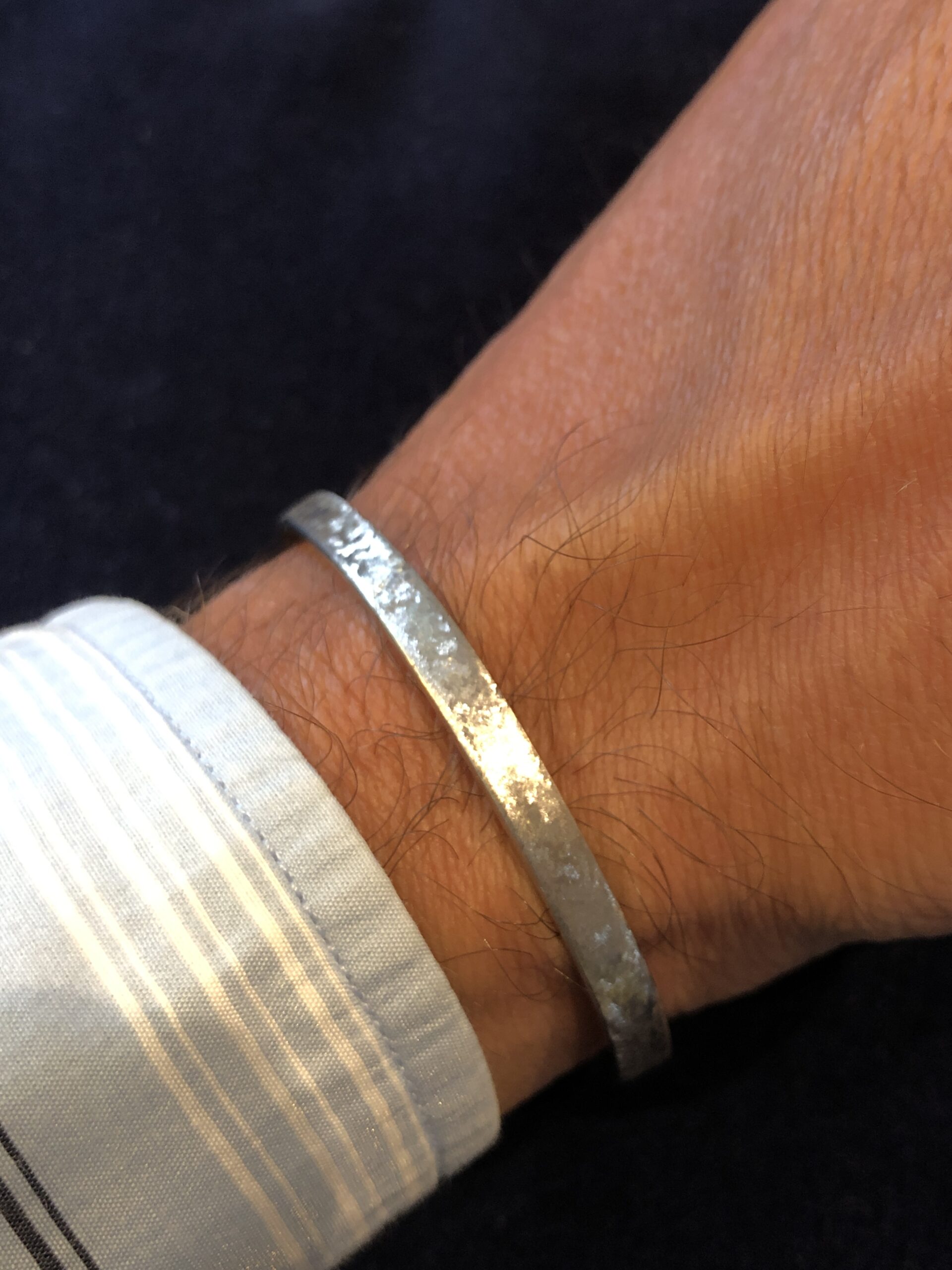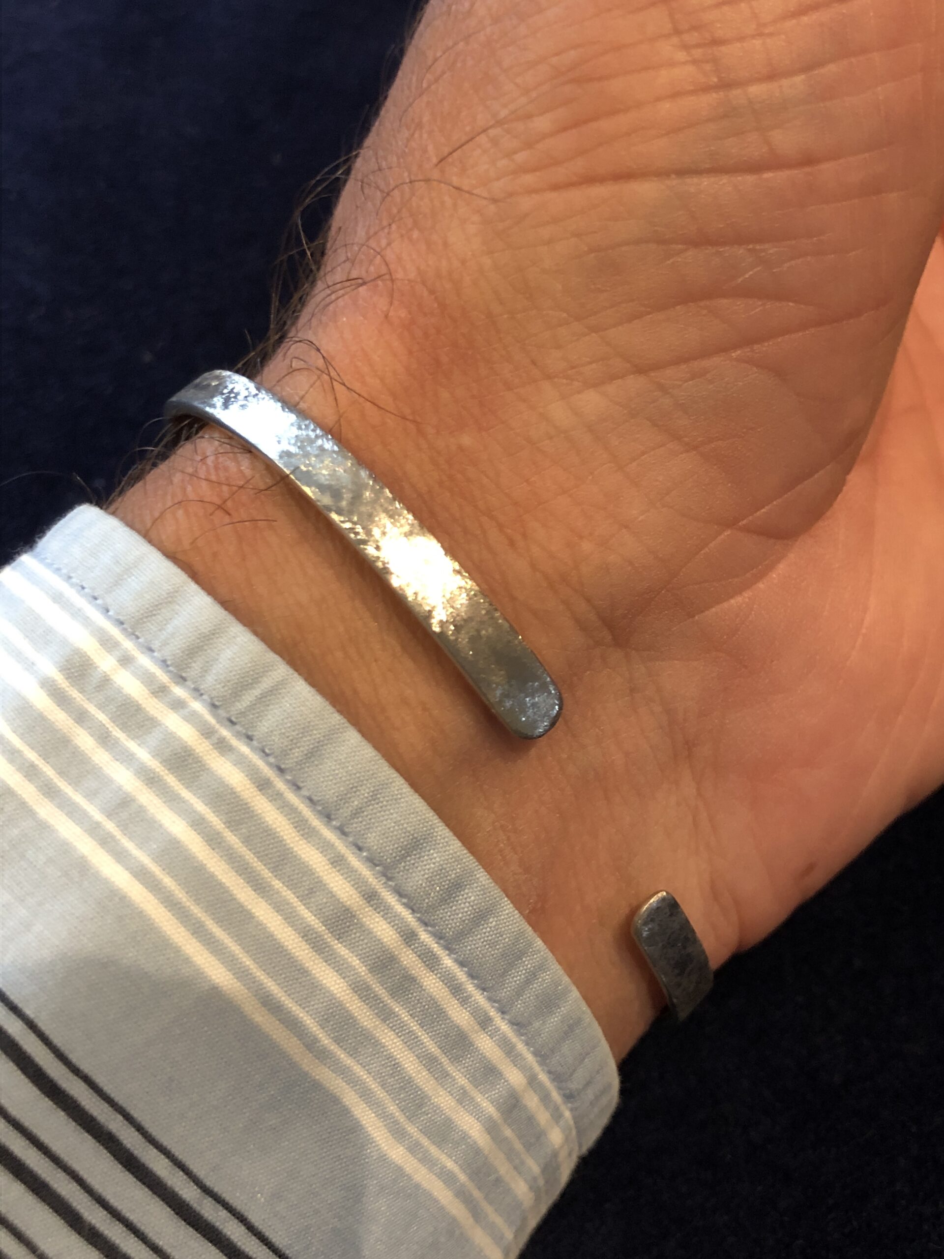 Die Länge des Armreifs ist auf den Handgelenksumfang des Trägers bzw. der Trägerin abgestimmt, und die Breite lässt sich von schmal bis sehr breit frei wählen. Das Ergebnis ist eine ausgewogene, passgenaue Form, die sich angenehm am Handgelenk anlegt. Auf standardisierte Größen wird bewusst verzichtet, mit besonderem Augenmerk auf Passform und Tragekomfort.